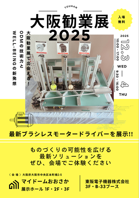 大阪勧業展2025に出展中!! 投稿日 2025年12月3日 著者 tohan_user カテゴリー お知らせ カテゴリー 新着情報 12/3(水)・12/4(木)「マイドームおおさか」で開催中の「大阪勧業展202」5に出展しております。 ブース番号は「B-33」になります。 ブラシレスモータードライバのデモ機やTシャツ君も展示しておりますので是非お立ち寄りください モーションコントロール、ODM開発のご相談は東阪電子機器へ 大切にしているのは、お客様とのコミュニケーション。22業界・1,700機種の開発実績を有する弊社の専門スタッフが、お客様のお困りごとに直接対応させていただきます。 お問い合わせ リンク 資料請求 リンク