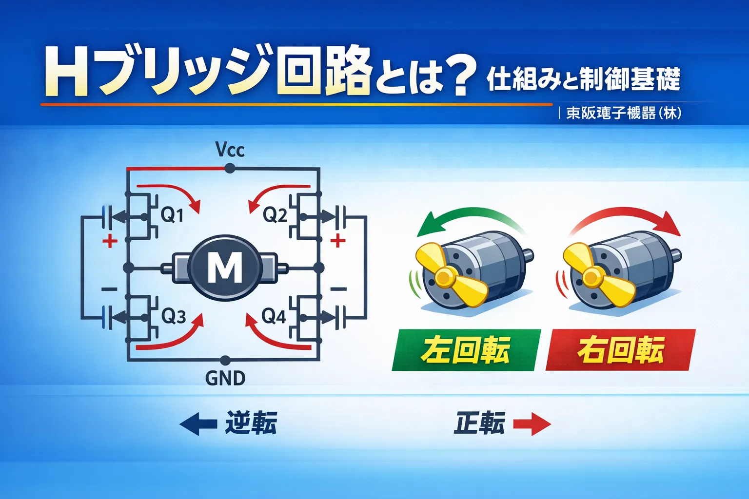 ①図3(Hブリッジの1基の状態です)でQ1、Q4をON:Q2、Q3をOFFの状態にすると。